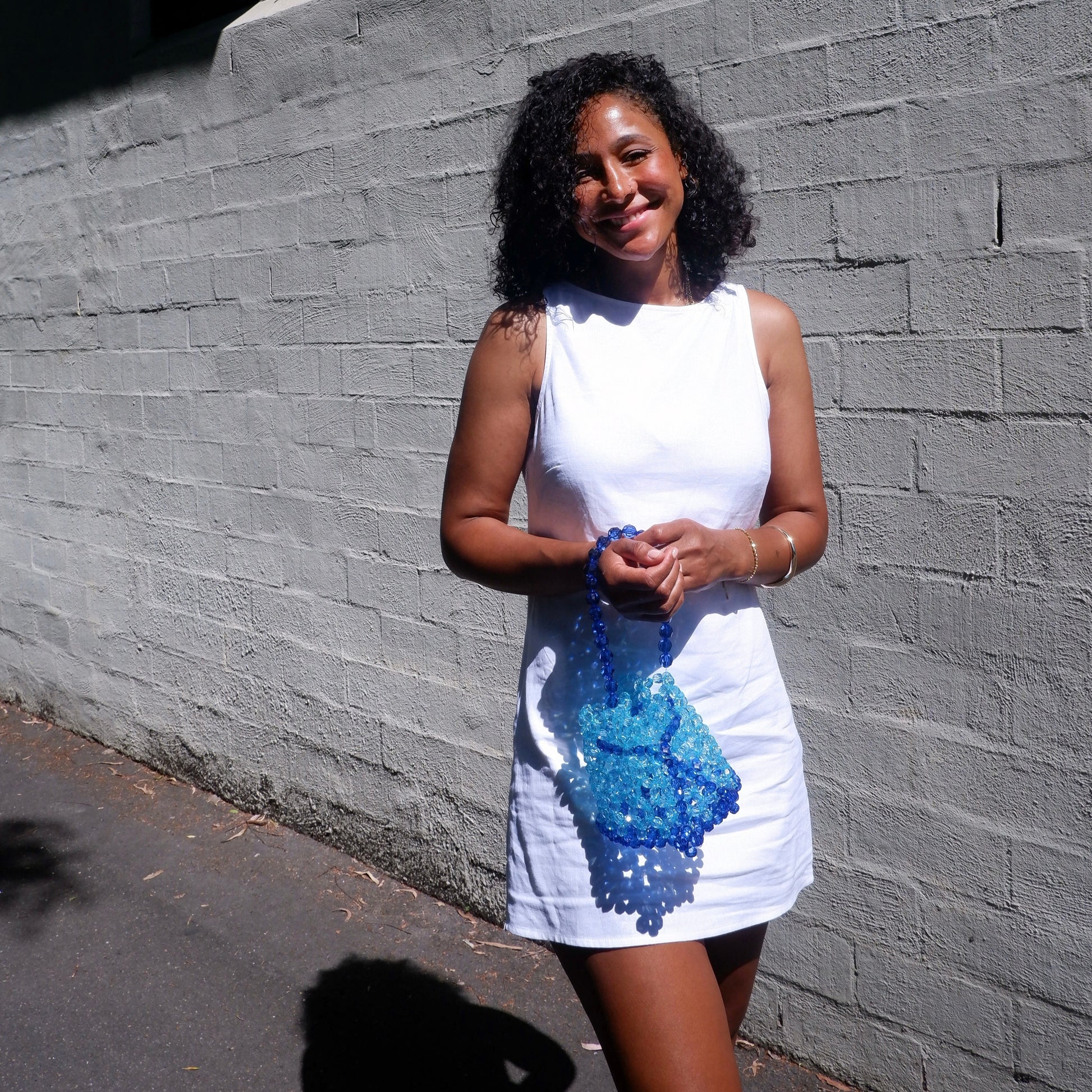 WHIMSY187 is a larger blue bucket bag that radiates summer charm and fun. Its round, roomy shape and sturdy beaded handle fits your wallet, phone, keys, makeup and anything else you need. Tighten the cord to close, or leave your bag open for a chic effortless look.